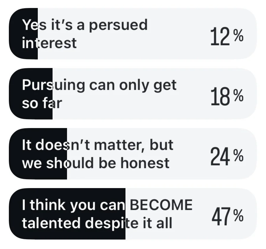 However, what if you’re just mediocre-gifted? Can that medium-level gift be turned into the gift? Can someone who started off seemingly barely talented pursue their way into a Broadway career or a Lincoln Center performance? According to my Instagram poll, almost half of you believe it can.